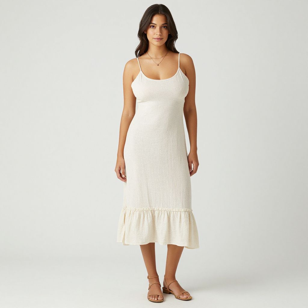 "Woman, casual summer style, cream-colored linen sundress, thin adjustable spaghetti straps, scoop neckline, ruffled hem, knee-length, paired with tan strappy sandals, simple necklace, white studio background.. Sexy. Pretty face and beаutiful eyes. Big breasts."