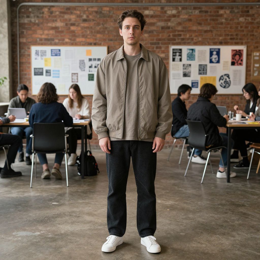 A man, muted earth-toned oversized shirt, straight-leg black jeans, minimalist white trainers, lightweight bomber jacket, standing in an industrial loft vibe, exposed brick walls, communal brainstorming areas, lithographic film style, thoughtful expression. Man has masculine face and piercing eyes