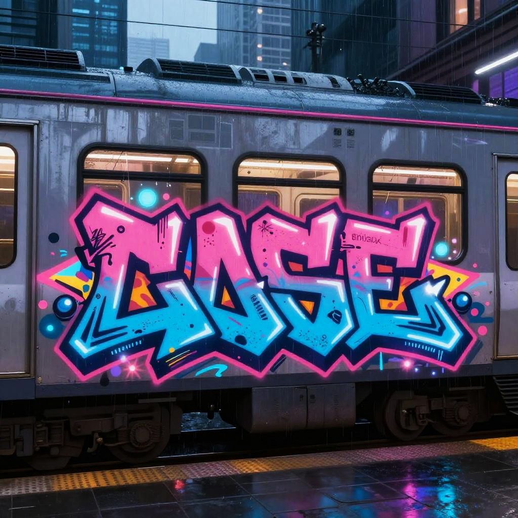 Grafitti generator producing intricate digital tags on a futuristic train car, glowing graffiti with animated effects, neon blues and hot pinks, detailed lettering with wildstyle influences, set in a rainy nighttime metropolis alley