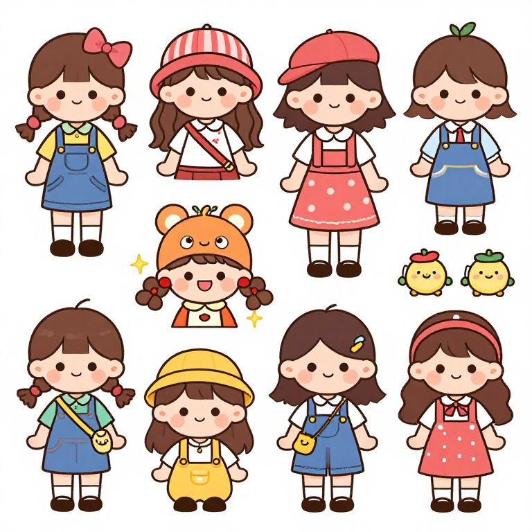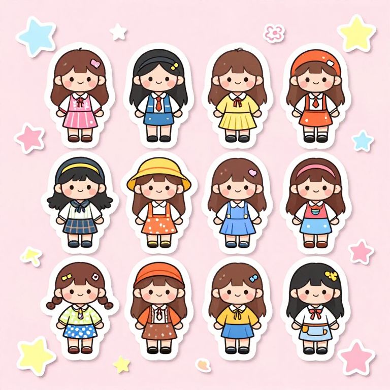 A charming collection of kawaii stickers featuring cute girl characters in various outfits and accessories, presented in a vibrant and playful cartoon style, perfect for planner scrapbooking and stationery enthusiasts.