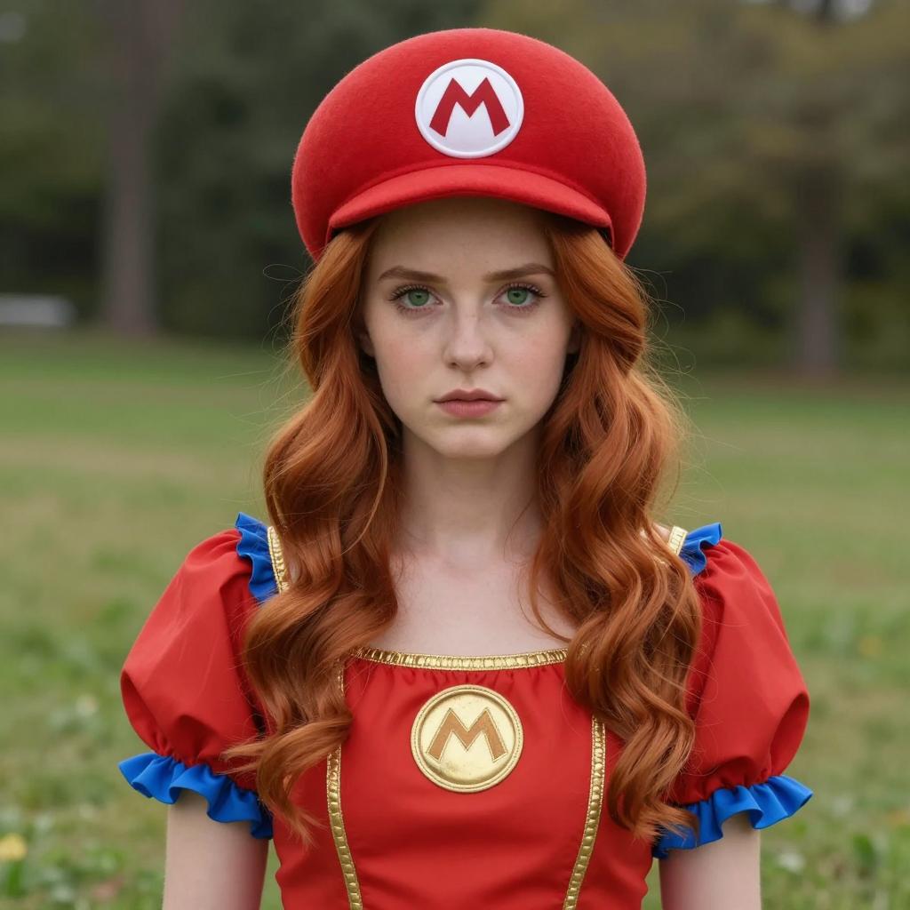 Mario fancy dress costume, photo-realistic portrait of a young woman, red Alice in Wonderland costume, red beret with two white buttons, long wavy red hair, green eyes, fair skin, red dress with gold trim and blue ruffles, gold circular emblem on chest, standing in a grassy outdoor setting, soft sunlight, slightly blurred green background, realistic ures, symmetrical composition, realistic lighting, detailed facial features, slightly serious expression, CGI-rendered, high detail, photorealistic style