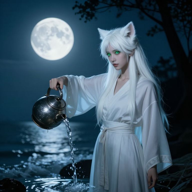 Color Psychology green eyed white fur female tabaxi cleric pours water near a sea shore big moon in background silhouetted by trees - Remix by,