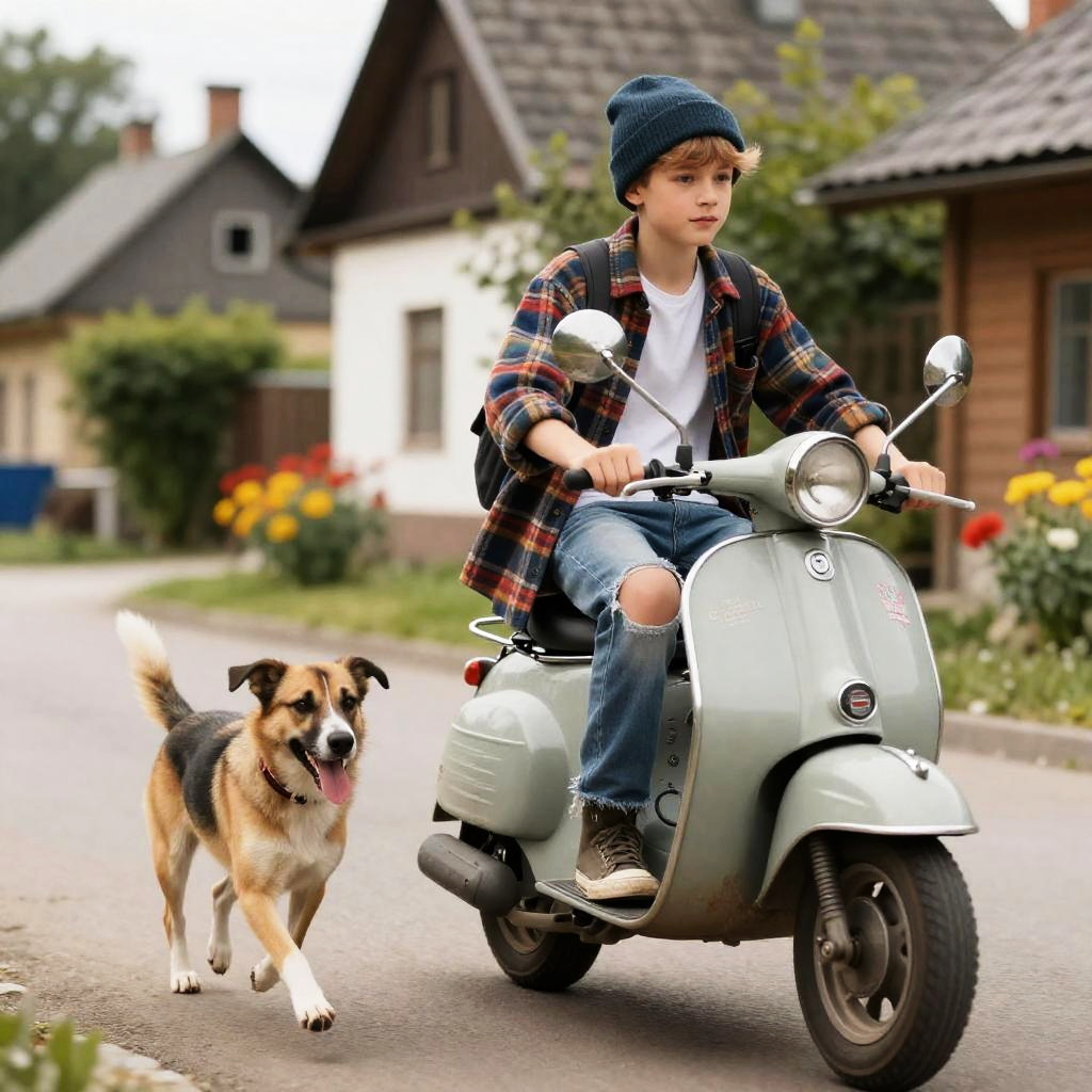 A digitally enhanced photograph featuring a teenage Eastern European boy dressed in retro 90s grunge flannel, ripped jeans and knit beanie, riding a well-worn Soviet-era moped. A friendly mixed-breed street dog is playfully trotting just behind him, tongue out, along a picturesque village road. It's a sunny early summer day, with vibrant flowers and lush green foliage all around, creating a whimsical atmosphere.