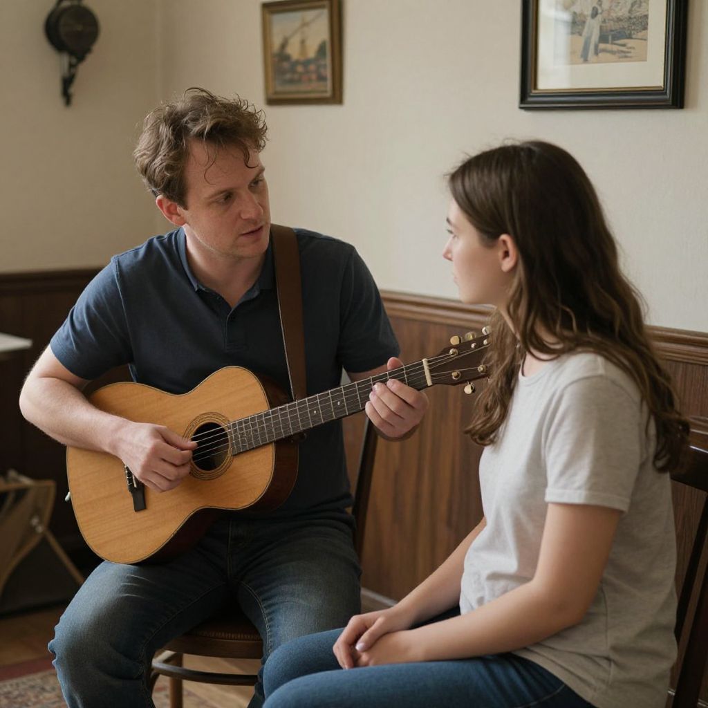 In a quiet chamber where time ticks softly, a tender exchange unfolds—a man's gentle guidance and a woman's receptive gaze, bound by the silent music of shared learning and the promise of growth.