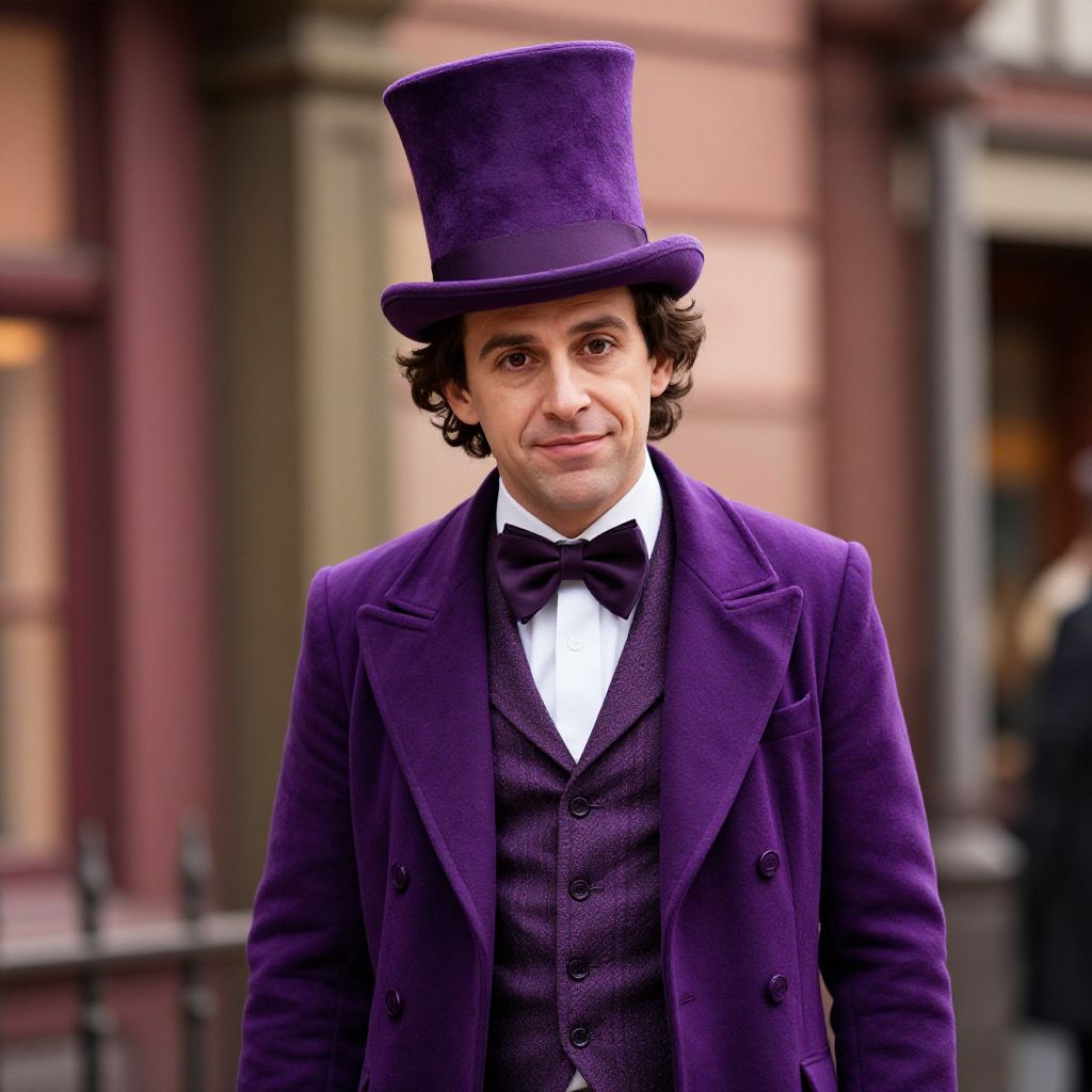 "Violet Costume Willy Wonka, man in a purple top hat and bow tie"