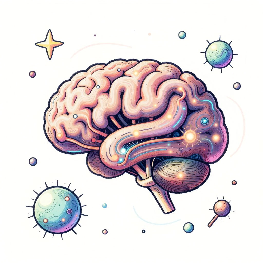 Cute cartoon neuron character with big eyes, smiling face, branching dendrites and axon terminals, glowing synaptic connections, surrounded by light particles, soft pastel color palette, floating in a stylized brain environment