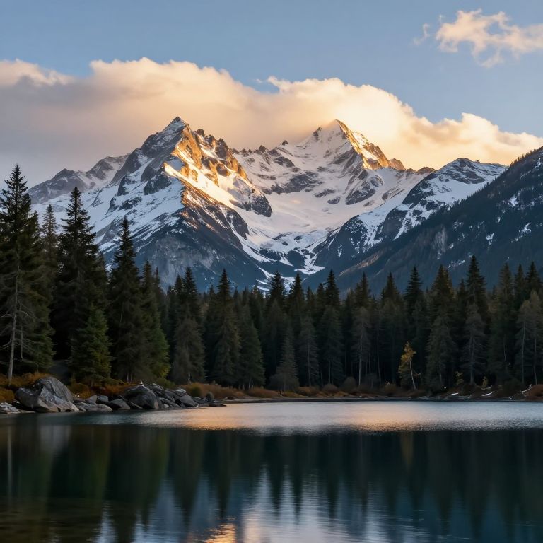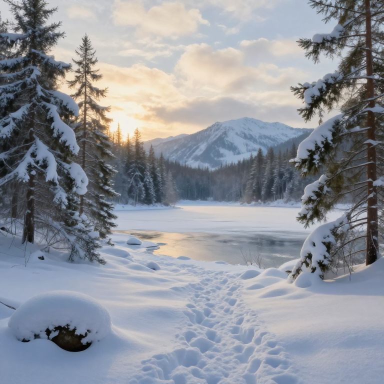 Rex a winter landscape of snowy mountains with a lake in the foreground, the mountains are reflected in the totally flat and smooth lake - 3D render,