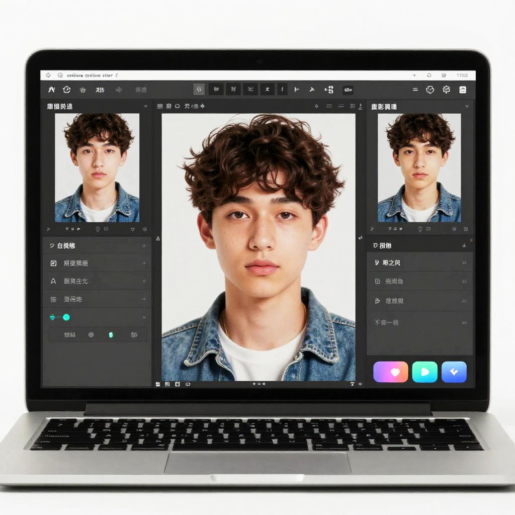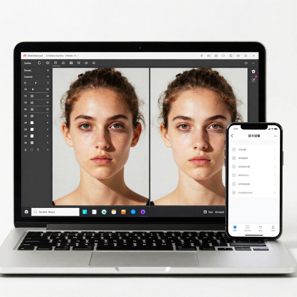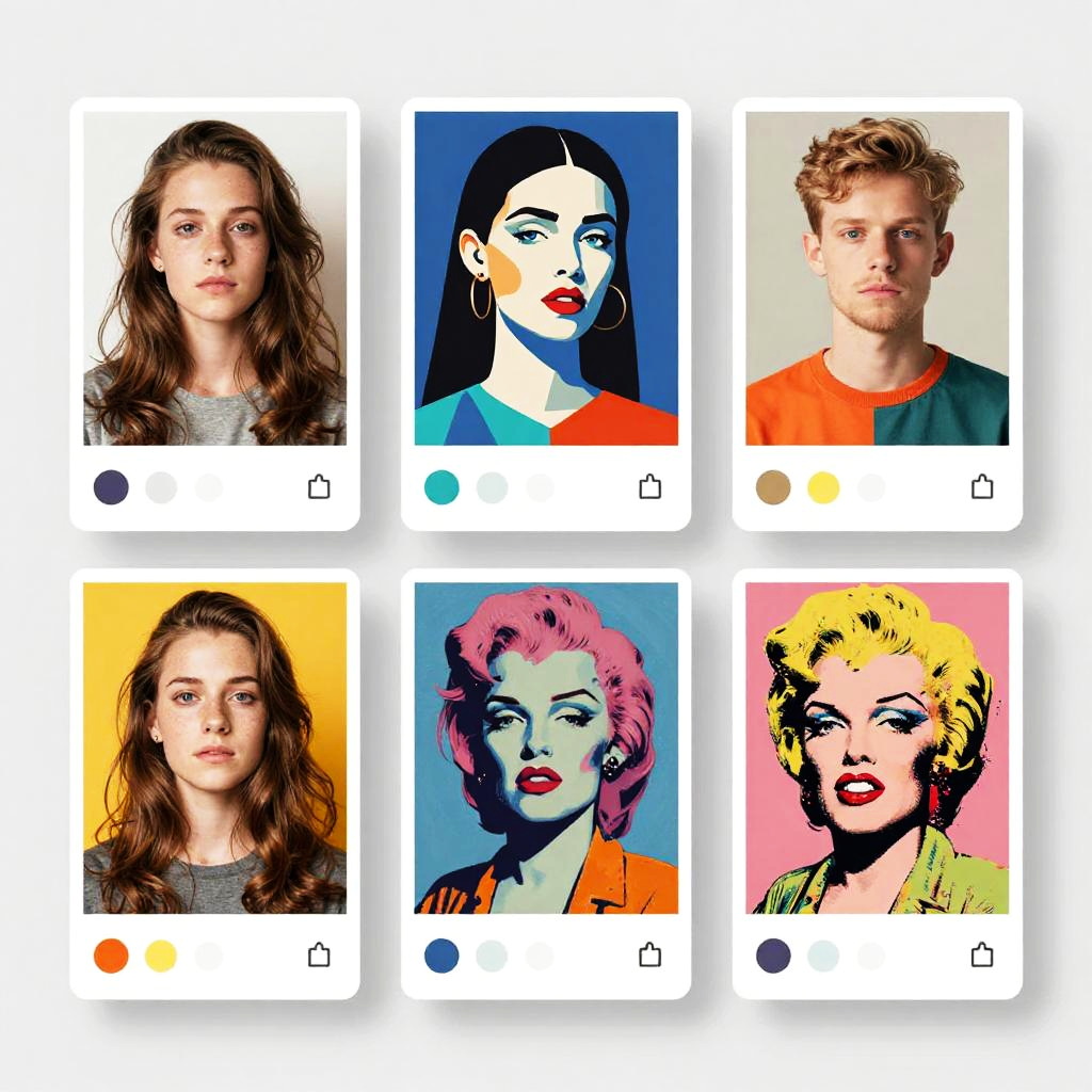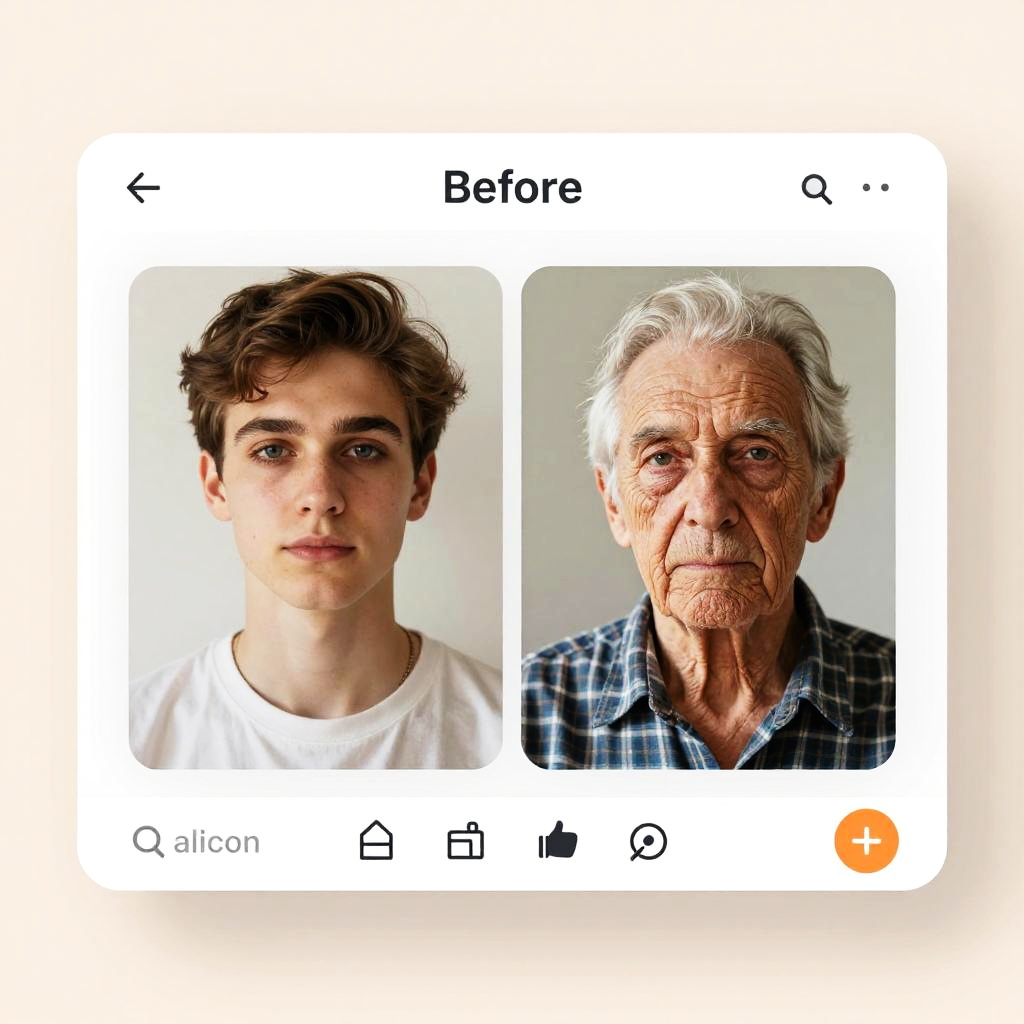 A futuristic smartphone interface displaying aging filters applied in real-time, with side-by-side comparison of young and aged versions of a face, vibrant colors, sleek design, and technological elements emphasizing AI and image manipulation.