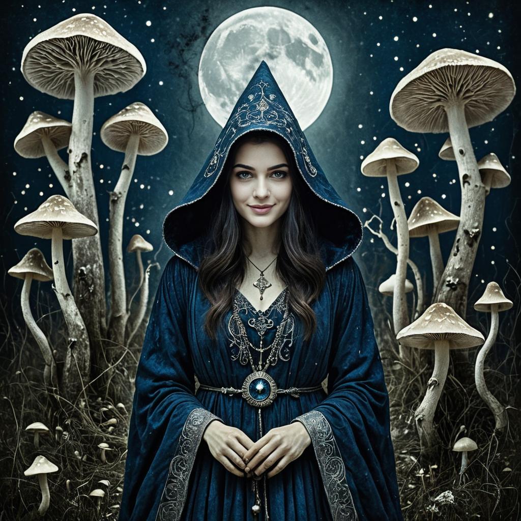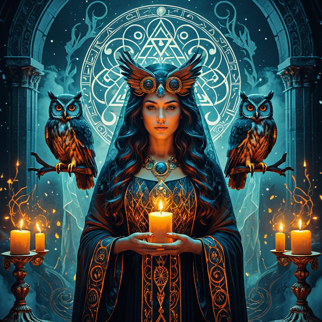 Young nomadic scout wearing fur cloak, in the forest at night with high trees, fiery crimson moonlight, and an owl, colorful art