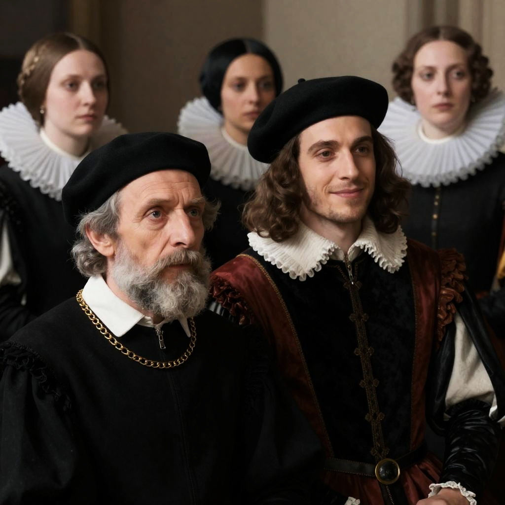 Photograph of a Renaissance scene. Central woman with brown hair in yellow bodice, white blouse, red skirt, and necklace. Men in black hats, brown vests, white shirts. One man holding open chest, woman gesturing. Stone wall background. Multiple people, intense expressions. Sunlight illuminating woman's face.
