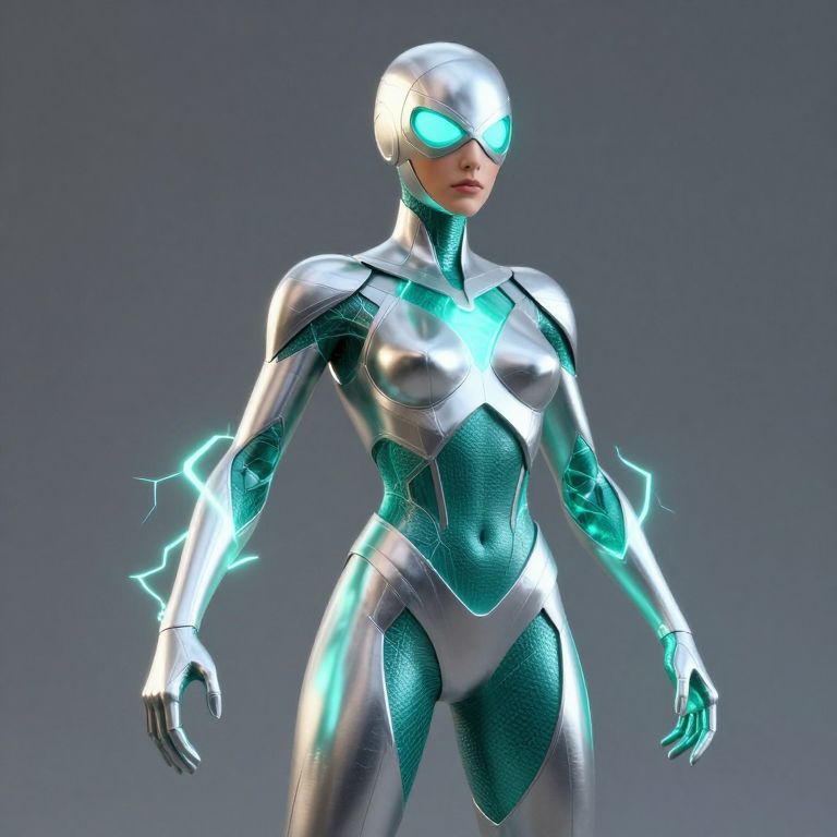 Geometric Shapes a silver and teal female dr. manhattan, teal lightning around hands and inside body, octane render,