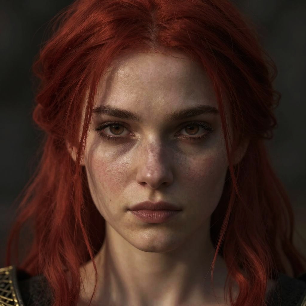 Elden Ring Malenia face close-up, haunting beauty, vibrant red hair strands, realistic skin texture, dark fantasy atmosphere, high resolution