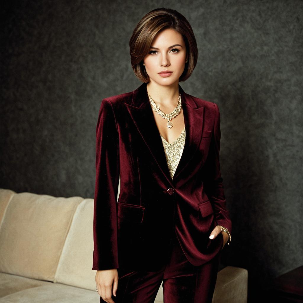 Crushed velvet suit woman,1girl, solo, realistic, brown hair, skirt, long hair, pencil skirt, formal, suit, pantyhose, brown eyes, skirt suit, jacket, lips