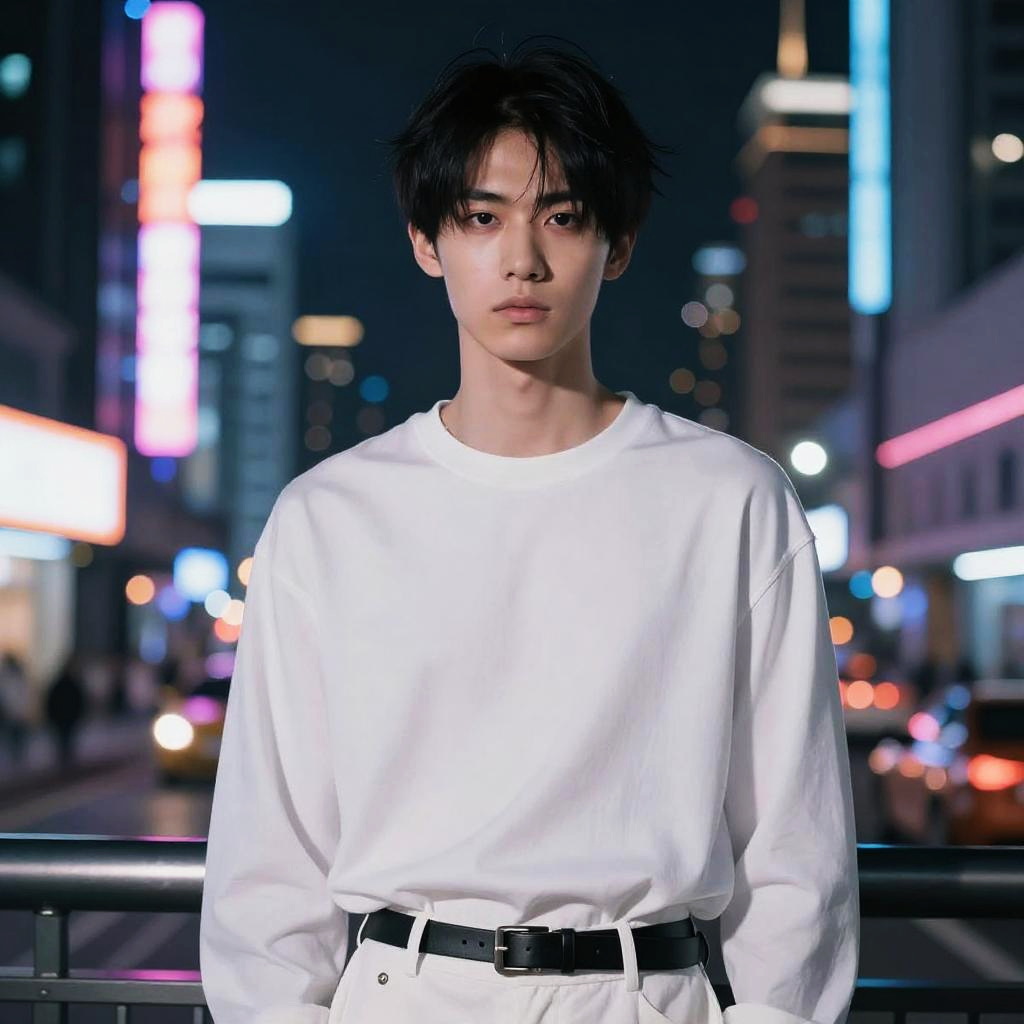 Japanese handsome male model with modern street fashion, urban Tokyo background at night, neon lights reflecting, confident expression, high detail, vibrant colors
