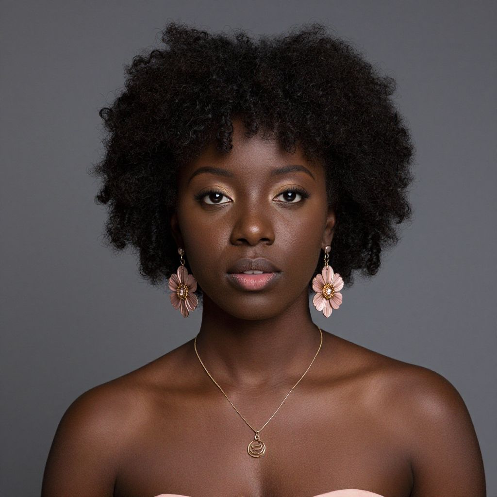 African american black hair, 1girl, solo, jewelry, dark skin, earrings, dark-skinned female, necklace, black hair, flower, dress, bare shoulders, very dark skin, lips