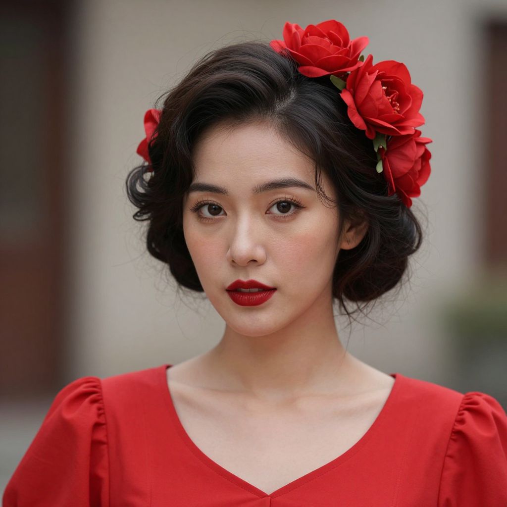 Red Frock Woman Costume, a close up of a woman in a red dress with red flowers in her hair
