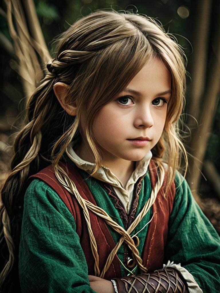 Photorealistic portrait of a child dressed in a Pascal costume from the movie Tangled, featuring detailed braided hair, a green and purple outfit with leather straps, set against a blurred natural forest background. The image captures cinematic realism with soft lighting and sharp facial features.