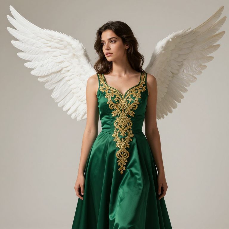 Female angel with wings on her back and a green dress with gold embroidery on the front.