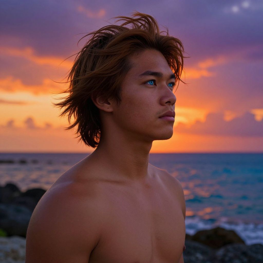 Create a superrealistic portrait of a young Micronesian man with dreamy blue eyes, chiseled features, and tousled chestnut hair styled in a casual, wind-blown manner. He stands at the water's edge on a rocky shoreline, set against a vibrant sunset backdrop, gazing out toward the distant horizon. Utilize sfumato techniques to blend light and shadow, evoking a sense of serene contemplation and emotional depth. Capture the intricate play of colors in the sky, where fiery oranges and deep purples merge with the cerulean expanse of the ocean, harmonizing with the man's introspective demeanor amidst the breathtaking natural scenery.