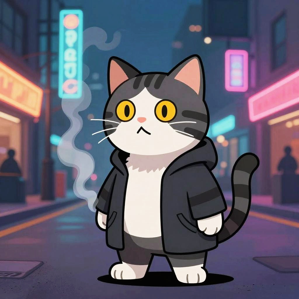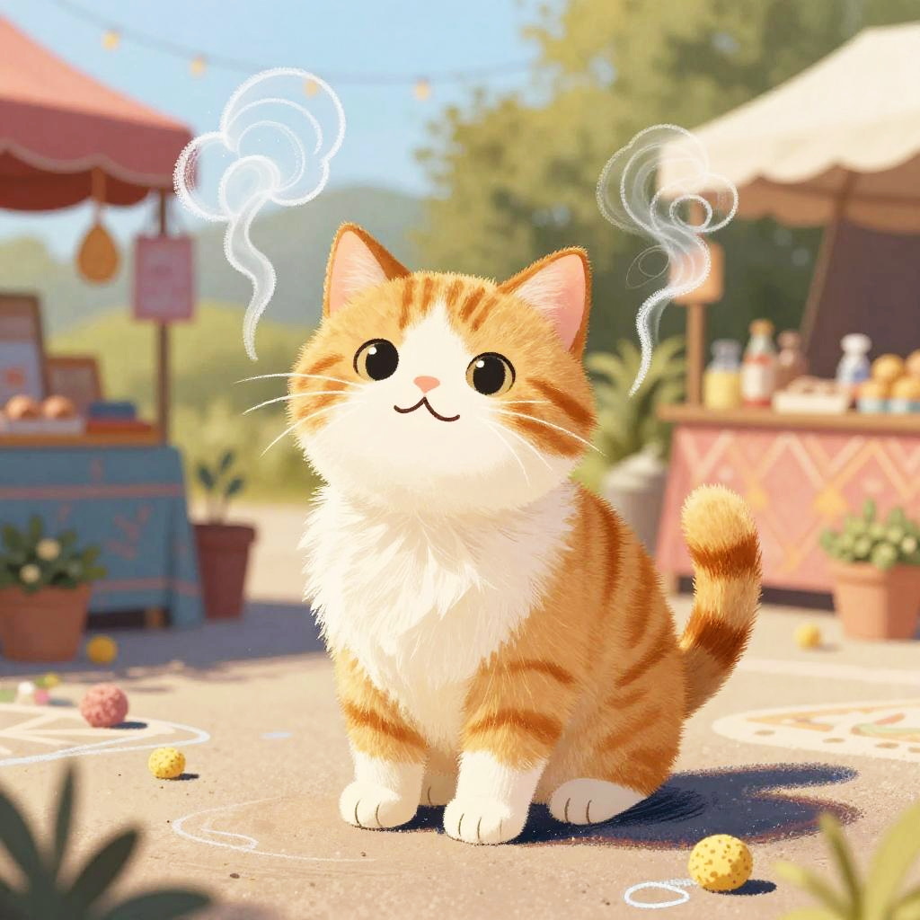 Whimsical depiction of a playful cat with smoke cream coat, animated in deliberate ink blotches against an idyllic snowy glade