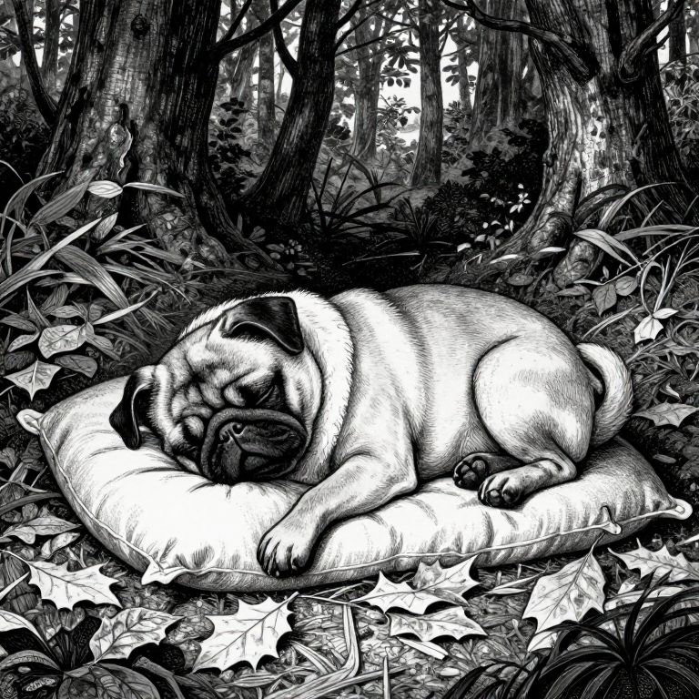 Adorable pug who is sleeping on a pillow made of dry leaves in a dark forest, detailed illustration in dotted, black and white, in the style of gustave dore's dante's inferno