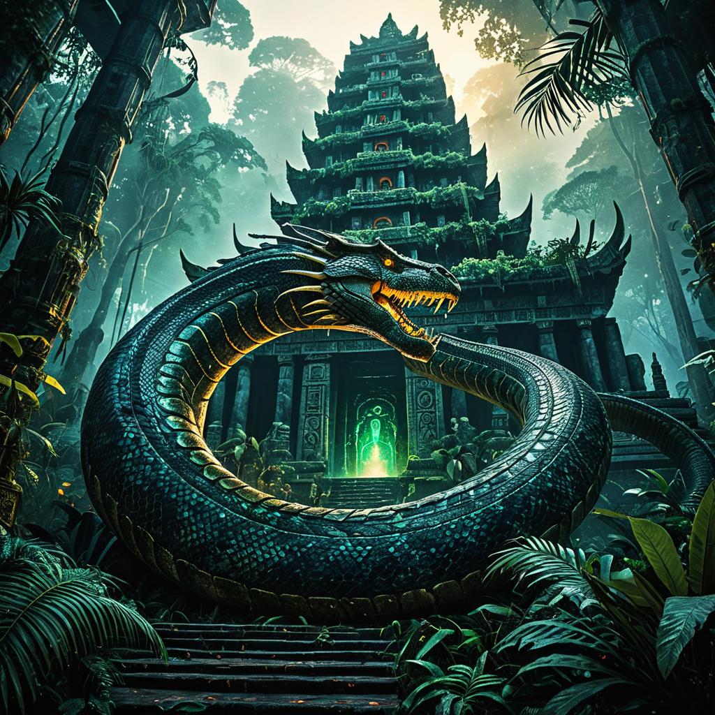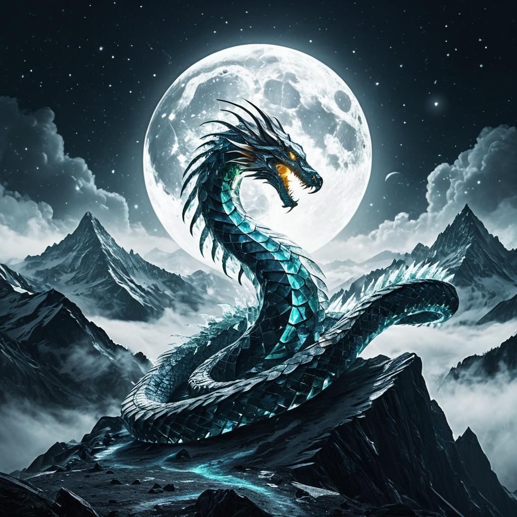 A fantastical digital artwork of an enormous crystal serpent, featuring glowing facets and swirling mist around it, in a foggy mountain peak under a silver moon, created in ethereal digital fantasy art, awe-inspiring and serene