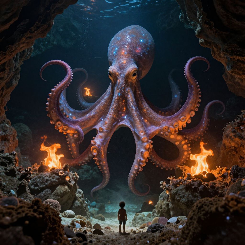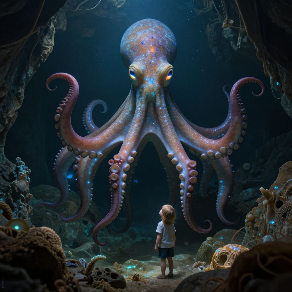 In the depths of an ancient cavern, a colossal octopus stands as a guardian of serenity, its bioluminescent eyes casting an ethereal glow upon a child who gazes up in awe, symbolizing the delicate balance between wonder and vulnerability in the face of the unknown.