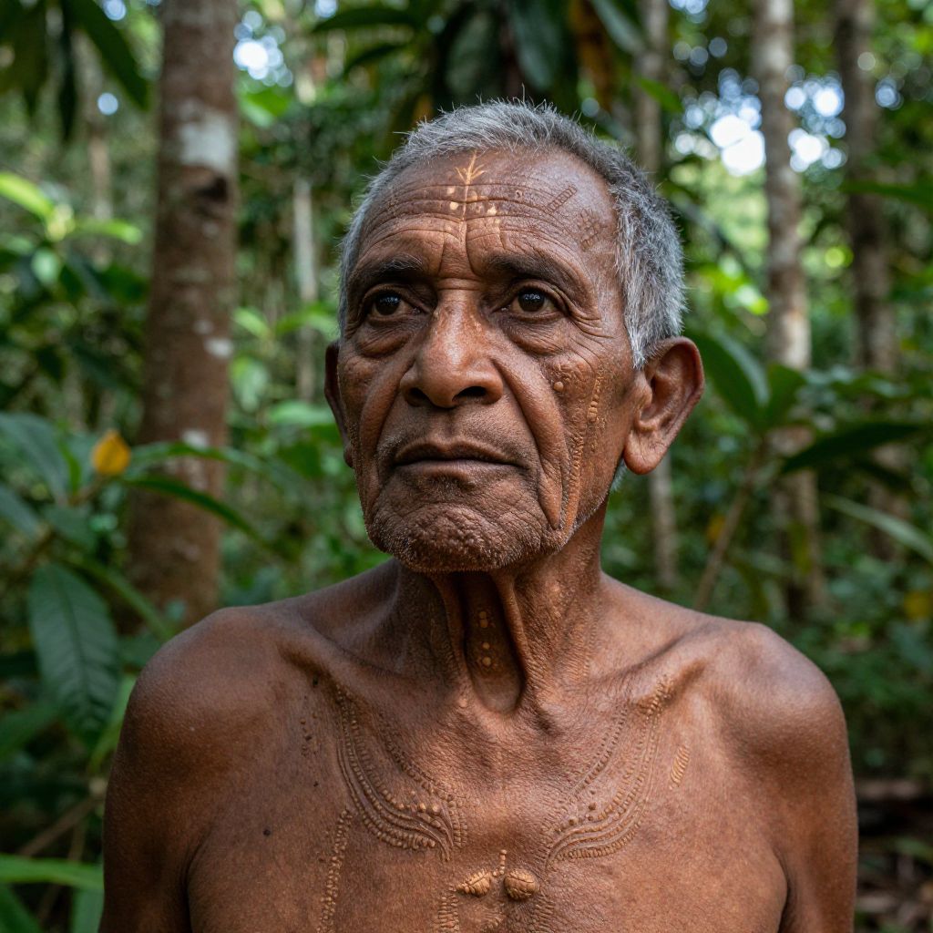 Envision a meticulously detailed portrait of an impassive elder from the Amazon rainforest tribe, captured in sharp focus against the verdant greenery of his natural environment. The bright sunlight penetrating the dense foliage creates a mosaic of light and shadow on his aged features, revealing the ancient symbols etched into his skin by ancestral knowledge. His piercing gaze, full of age-old wisdom and resilience, seems to extend beyond the frame as he stares off into the horizon with an untold narrative hidden within his eyes. This perspective harmoniously blends traditional representation with the raw splendor of nature, establishing a spectrum of emotions that pay homage to human heritage and our deep bond with the unspoiled world surrounding us.