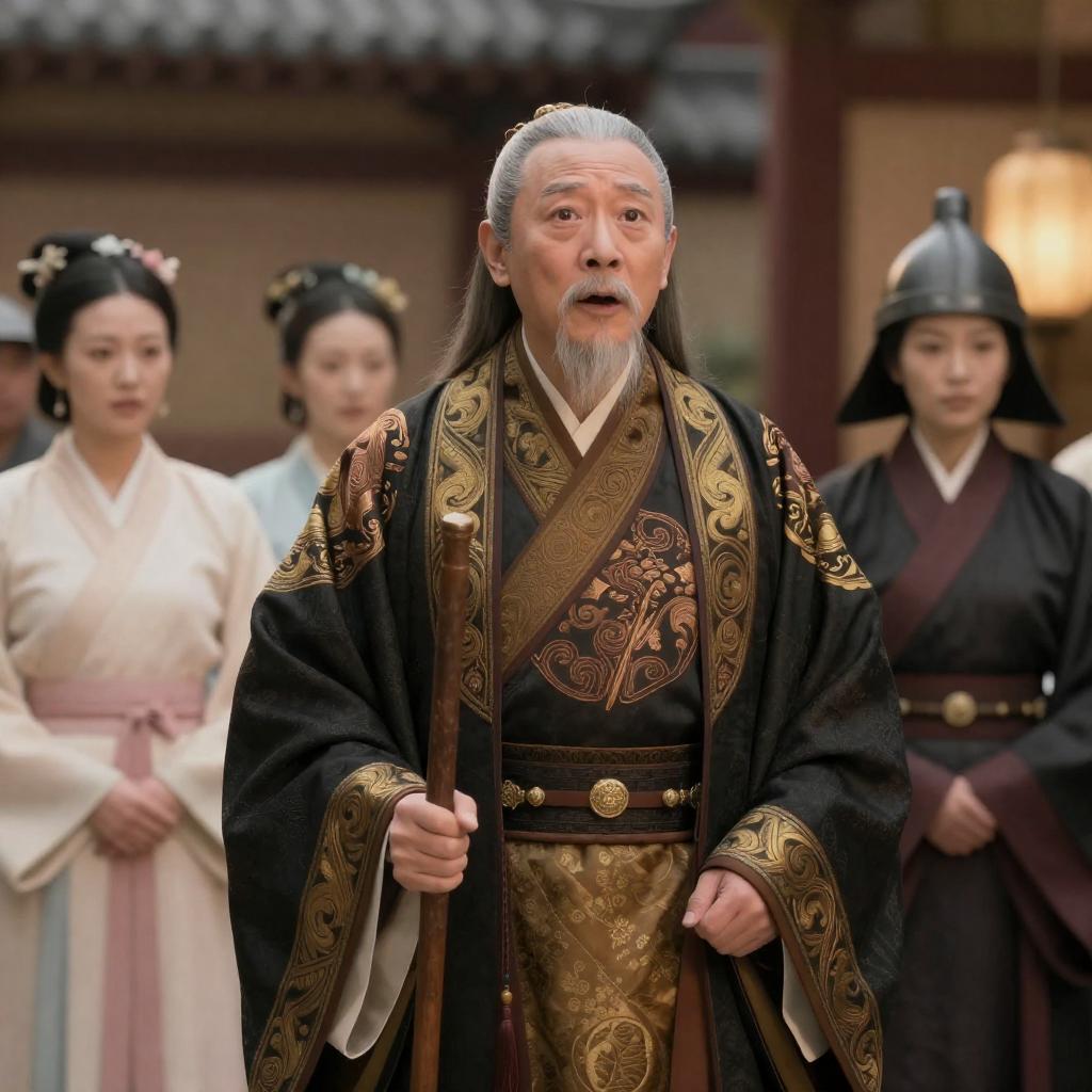 Old Chinese man in elaborate black and gold traditional robe with intricate patterns, standing center, holding a stick. Three women in traditional dresses to the left, one woman in black robe with helmet to the right. Background has traditional Chinese architecture. Warm lighting. Man has surprised expression.