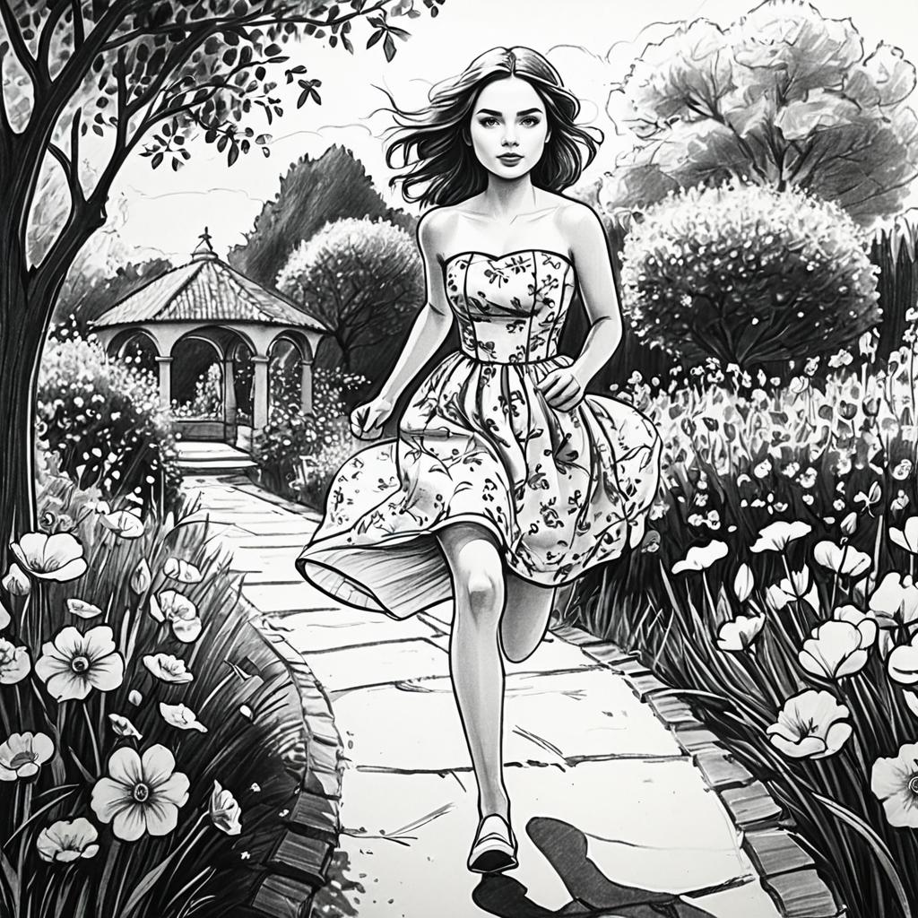 Sketch, monochrome, traditional media, pencil drawing, 1girl, strapless dress, running in the garden, floral background