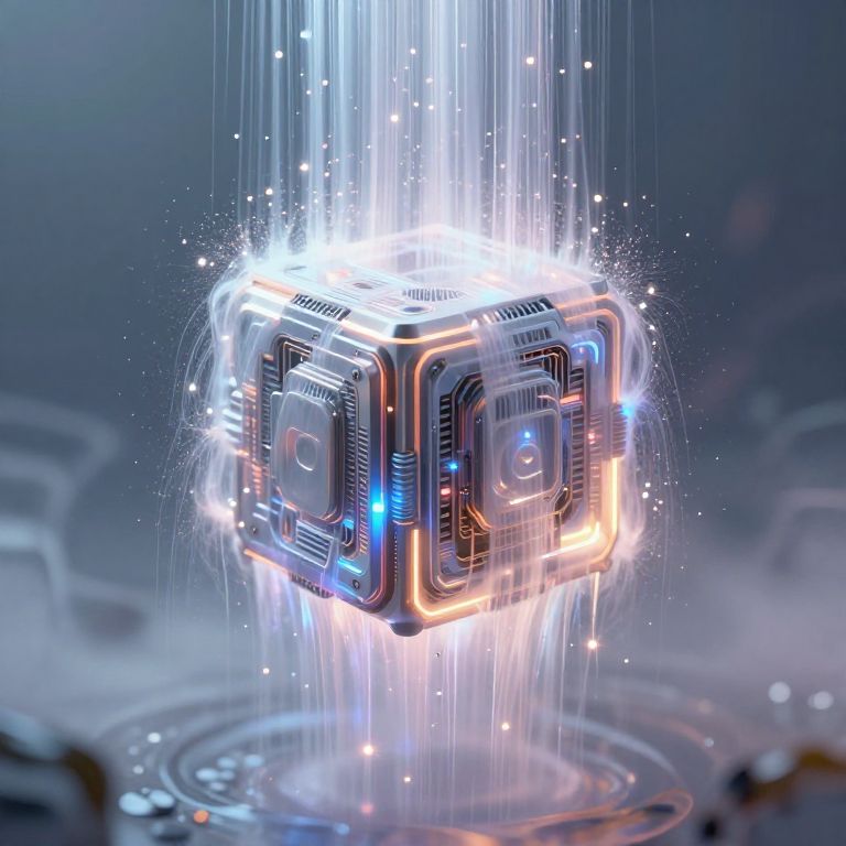 Surreal image of midjourney stable diffusion showing cascading streams of light particles dispersing and merging into a stable shape resembling a futuristic AI core, surrounded by an ethereal, misty environment with vibrant highlights and detailed textures.
