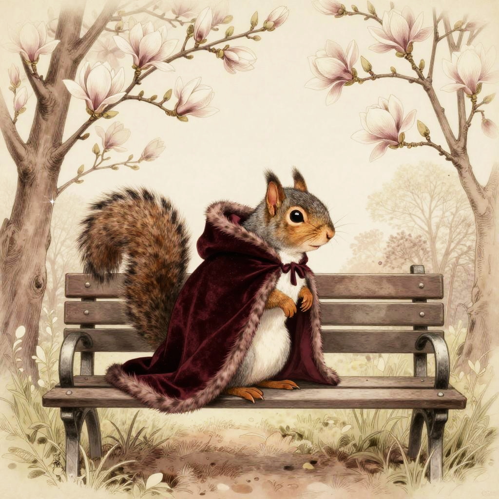 A wistful grey squirrel wearing a deep burgundy velvet cape lined with faux fur trim, set in a quiet city park bench encircled by blooming magnolia trees, vintage illustration aesthetic with delicate linework and fine crosshatching, muted warm palette on a soft cream backdrop, ornate botanical detailing, gentle and charming atmosphere, soft rim lighting, subtle paper grain texture, balanced and symmetrical composition, slight vignette, natural bokeh sparkle, ultra clean edges, high fidelity details
