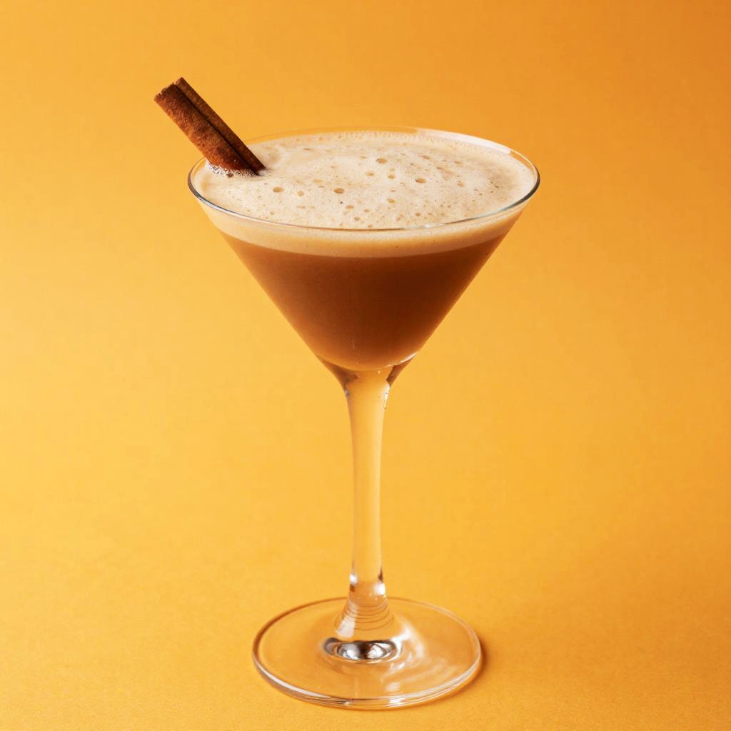 A photograph of a martini glass filled with a frothy, brown drink topped with two cinnamon sticks. The background is a vibrant, solid orange, making the drink stand out. The glass is clear and has a thin, elegant stem. The drink's texture looks creamy and rich, contrasting with the smooth, shiny surface of the glass. The overall style is simple and modern.