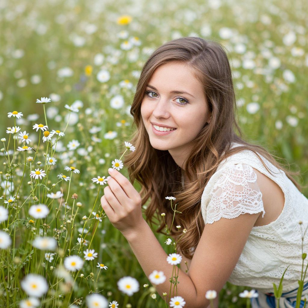 Photograph of a young Caucasian woman with wavy, brown hair, smiling gently while holding a daisy close to her chest. She wears a white, sleeveless, lace-trimmed top and a simple silver ring on her left hand. The background is a lush field of white daisies with yellow centers, slightly blurred to emphasize her. The sunlight softly illuminates her face, highlighting her natural, light makeup and relaxed, joyful expression. The overall mood is serene and cheerful, capturing a moment of simple beauty and connection with nature.