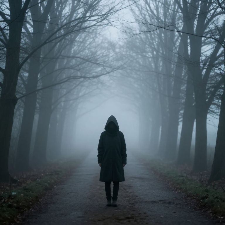A photograph captures a misty, blue-toned forest path lined with tall, leafless trees. Central to the image is a solitary figure, seen from behind, wearing a dark, hooded coat and black pants, walking away from the camera. The dense fog envelops the background, creating a haunting, ethereal atmosphere. The path, slightly uneven and covered with fallen leaves, stretches into the foggy distance, drawing the viewer's eye towards the vanishing point. The overall mood is mysterious and somber, with the muted colors and mist enhancing the sense of solitude and quiet.
