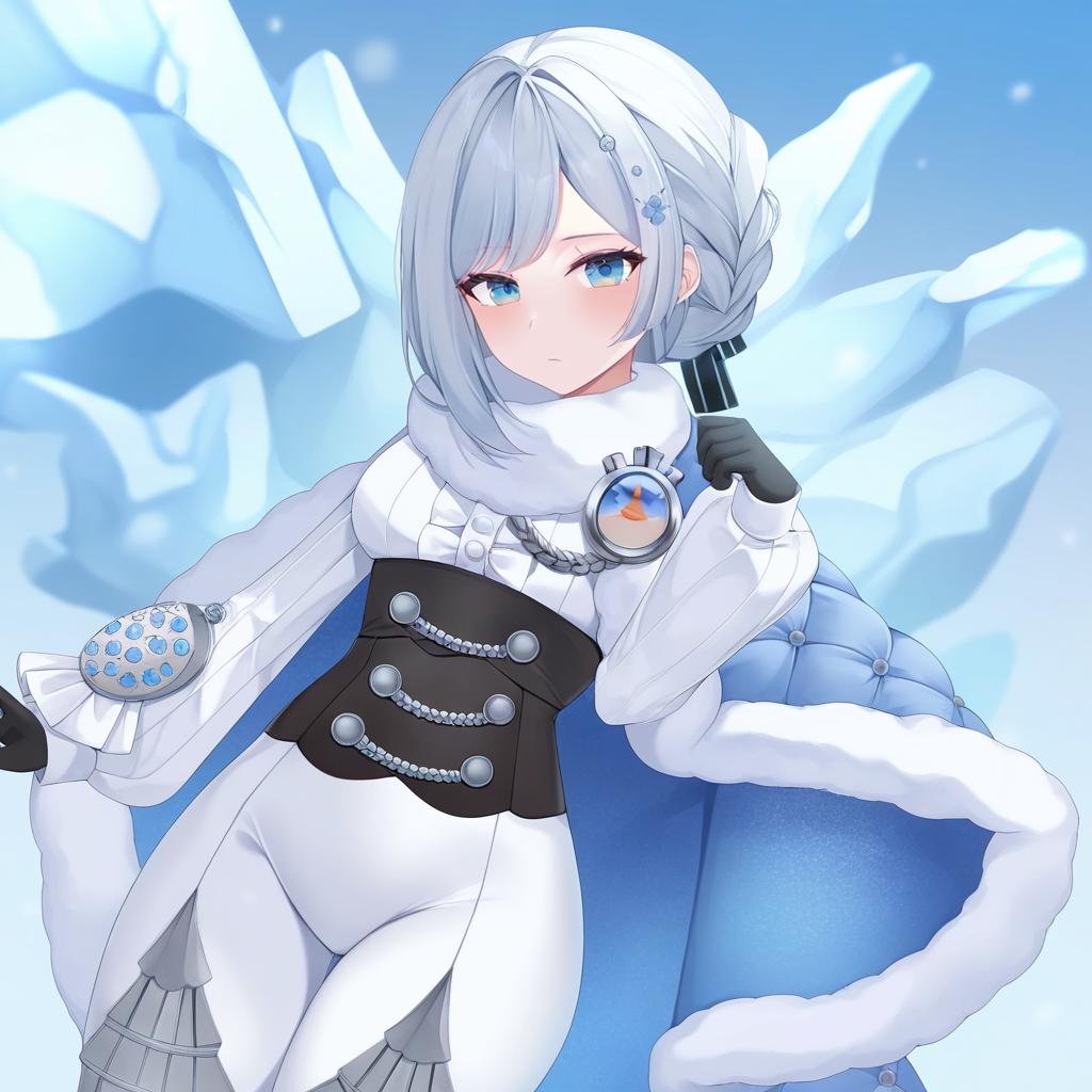 Digital illustration of an anime-style girl with blue eyes and short grey hair braided and adorned with a hair ornament. She wears a white tight bodysuit, a black corset, frilled long-sleeve shirt, black gloves, and a blue fur-trimmed padded cloak. The background features icy blue abstract shapes, suggesting a cold environment.