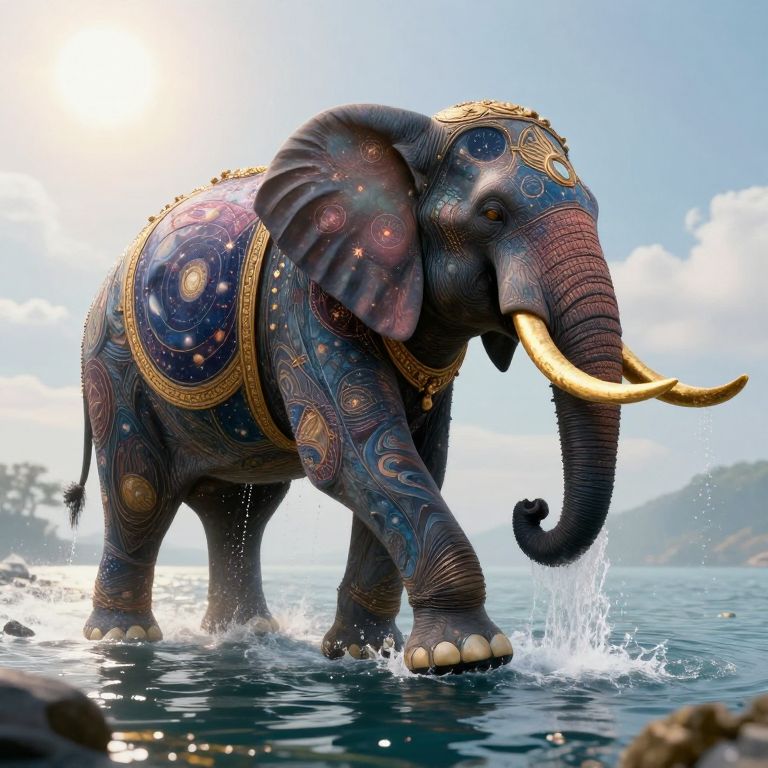 An ethereal clockwork elephant adorned with celestial tapestries strides gracefully through a tide-pool sky, its golden tusks gleaming under the sun's embrace, as each step releases cascading waterfalls of time, weaving a symphony of transience and eternity.