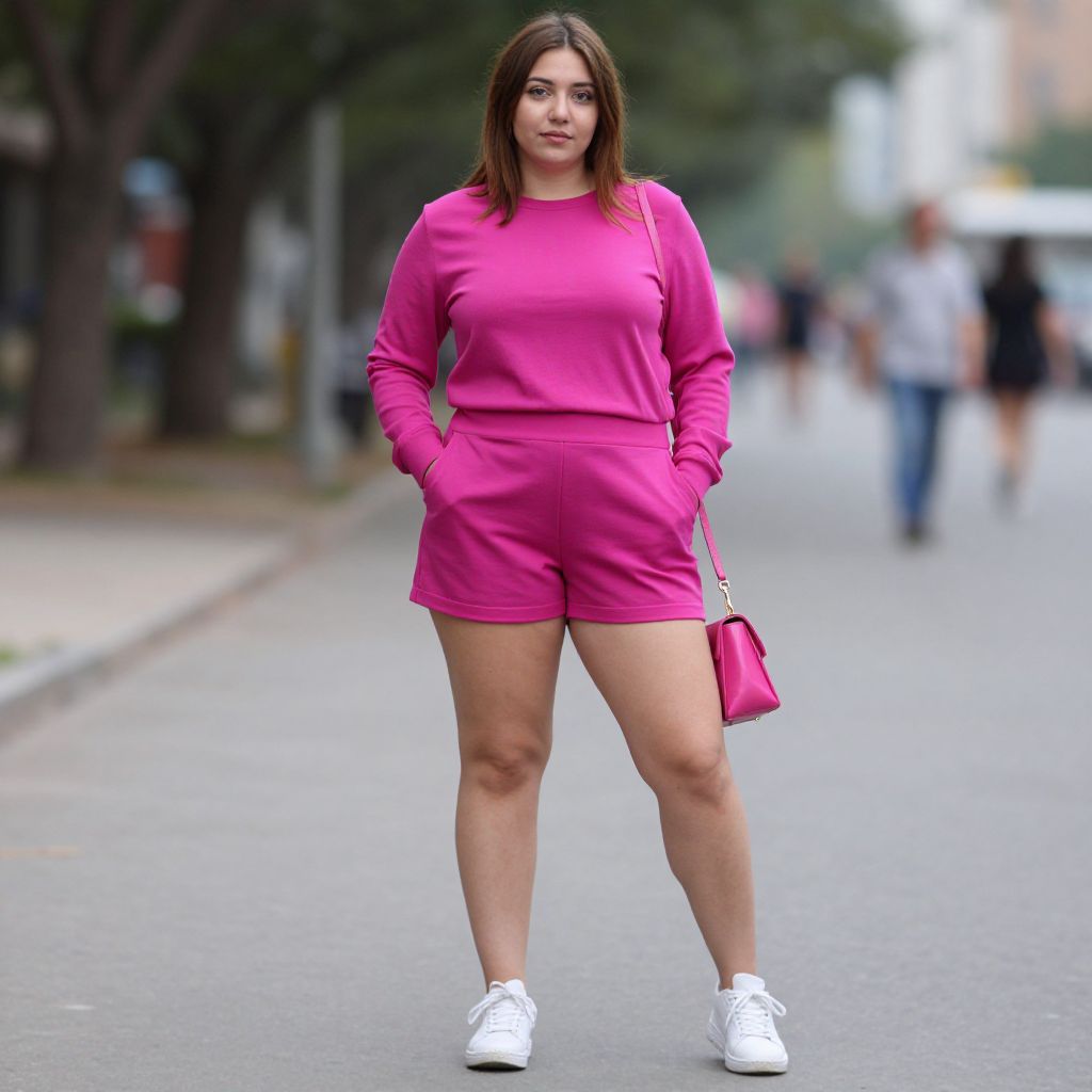 Plus size magenta costume, shorts, bag, solo focus, outdoors, hands in pockets, 1girl, blurry background, shoes, blurry, pink shorts, full body, realistic, standing, day, looking at viewer