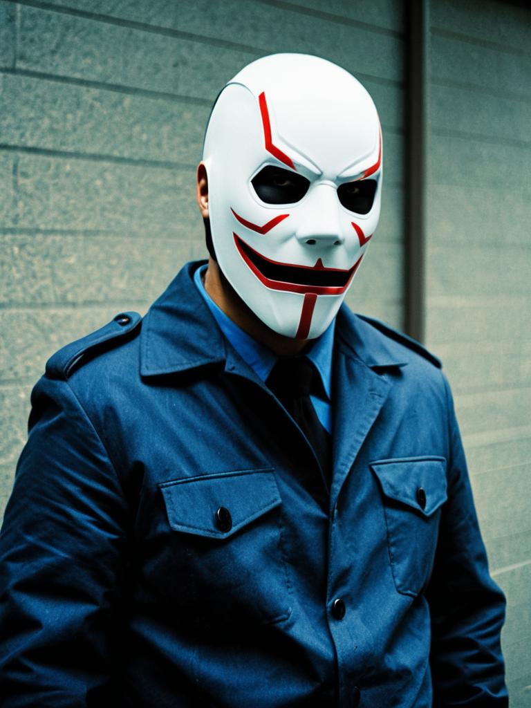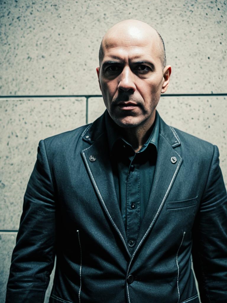 Portrait of a serious adult man dressed in a black cutthroat cosplay costume, featuring a black blazer with white stitching over a black button-up shirt. The man is bald and posed against a speckled stone wall, creating a dramatic and intense atmosphere.