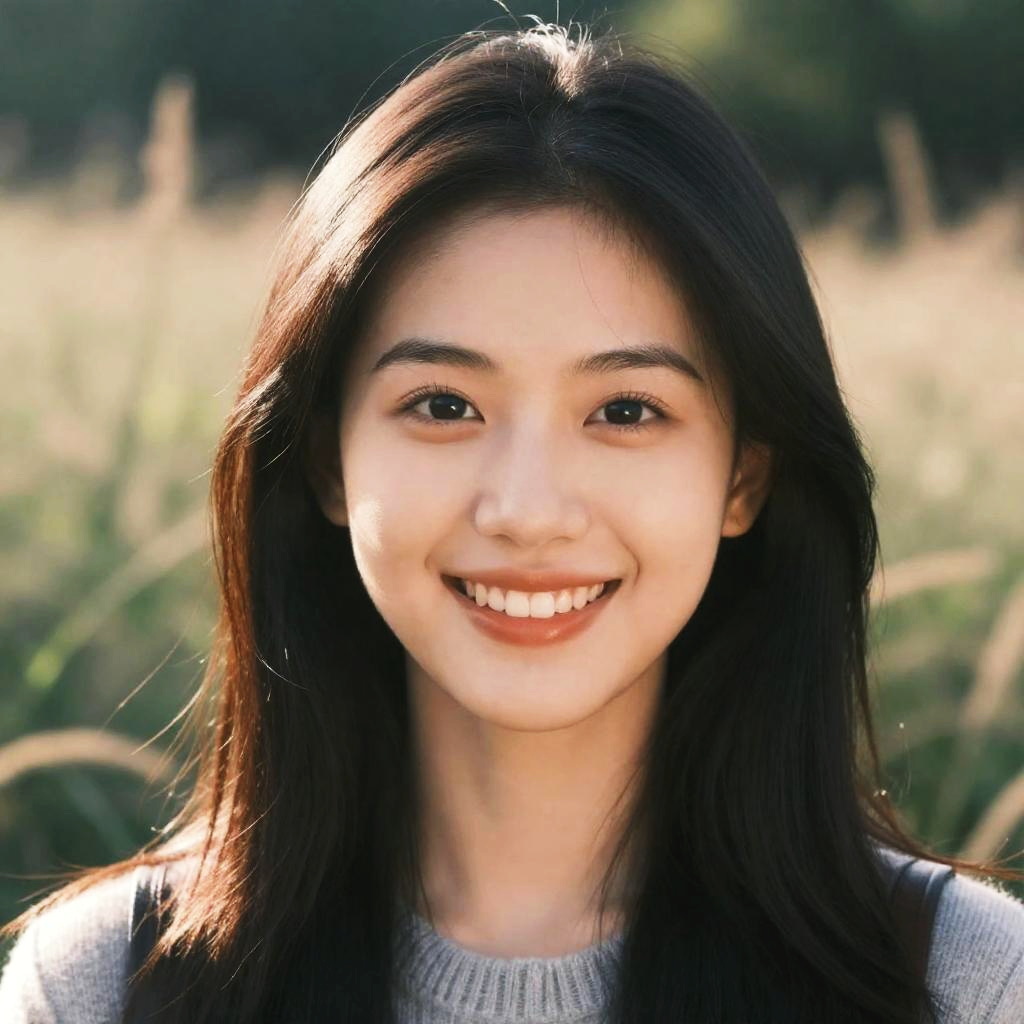 Photograph of a young woman with long, straight, dark brown hair and fair skin, smiling warmly at the camera. She's standing in a golden wheat field during sunset, with the sun low in the sky, casting a warm glow. She's wearing a simple white t-shirt. The wheat stalks frame her face, creating a natural, picturesque background. The sky is clear, transitioning from orange to blue.