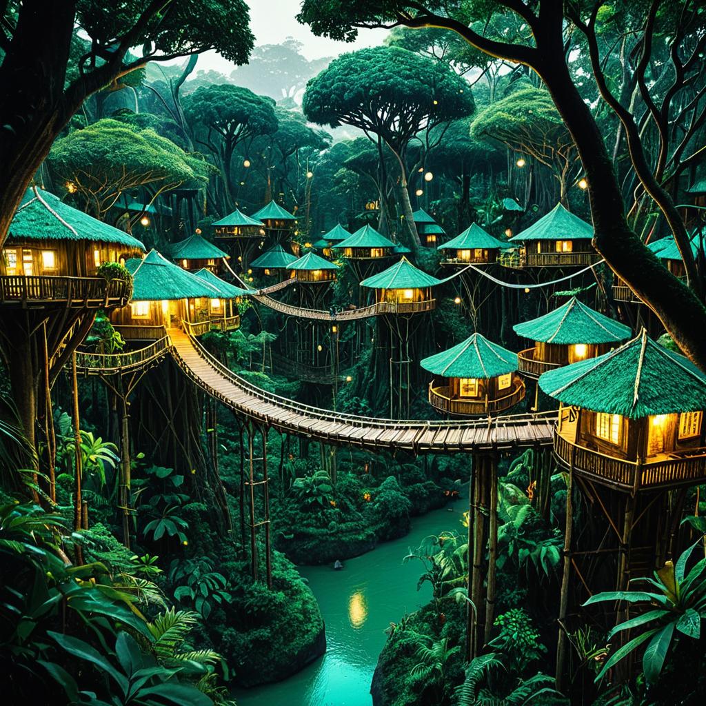 Fantasy landscape of a ancient tree giant stronghold in the jungle canopy, with bridges, lush green trees, and an aerial view of the expansive city.