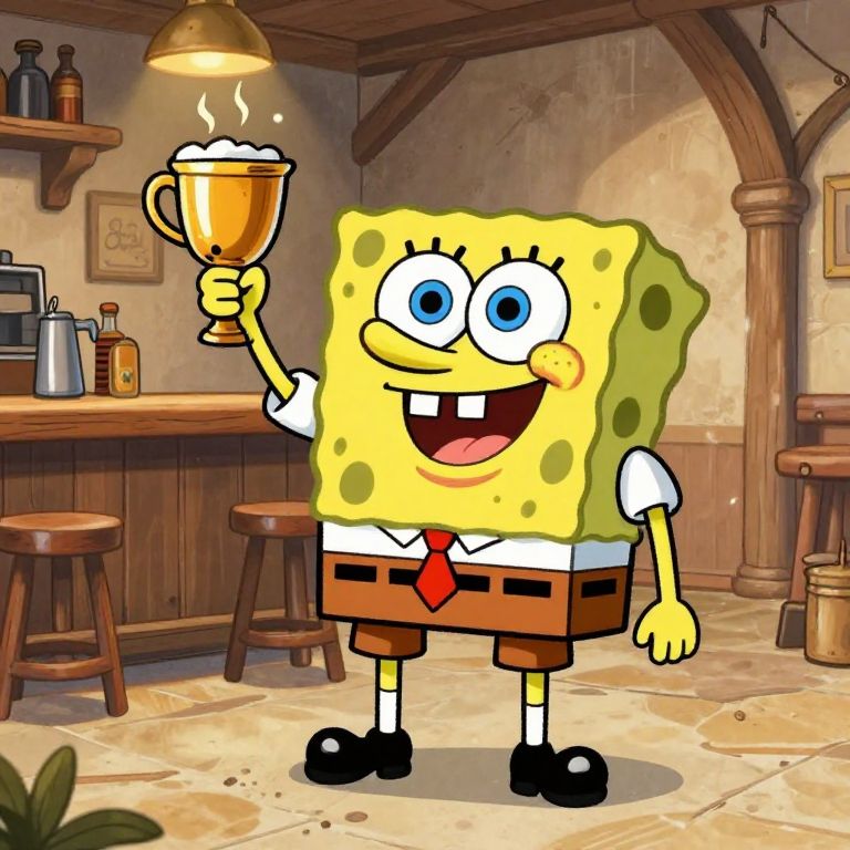 Sponge a digital drawing in the style of a neo traditional tattoo, a charming knight holding a golden cup up, cheers, in an old medieval pub,