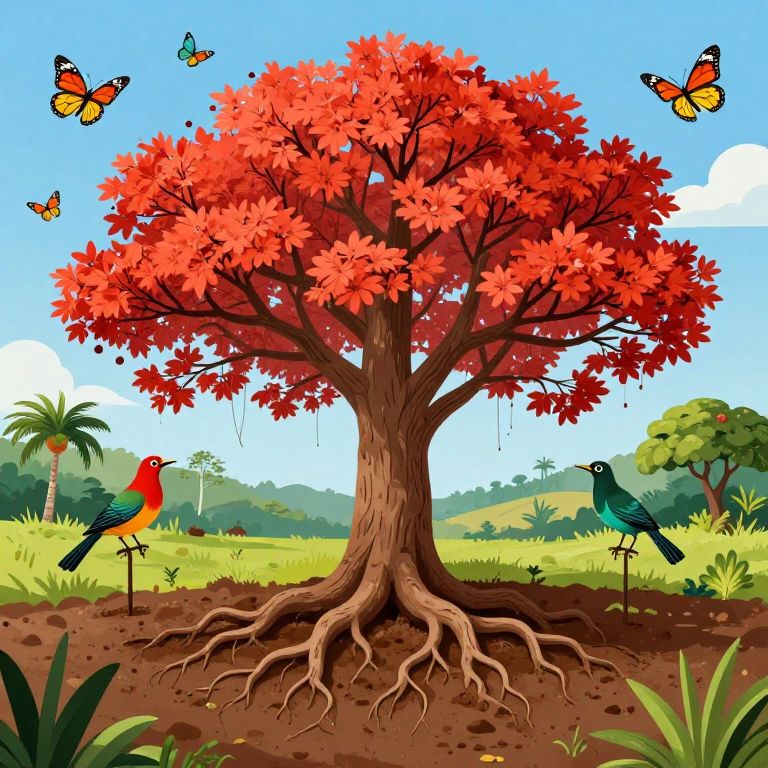 Illustration of a ceibo tree in a wild natural habitat, roots firmly grounded in rich soil, surrounded by colorful butterflies and tropical birds, under a blue sky with scattered clouds, emphasizing the ecological importance and symbolic presence of the ceibo in nature.