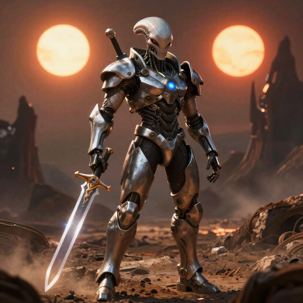 Half human half alien warrior in battle armor, merging organic and technological elements, holding an energy sword on a desolate alien planet with twin suns, dramatic atmosphere.