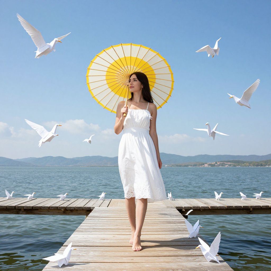 Woman holding a large, sunburst-patterned parasol stands gracefully on a wooden bridge suspended above a serene lake, surrounded by a flock of delicate white origami cranes that soar and perch around her, creating a dreamlike scene against a backdrop of distant mountains and a clear blue sky.