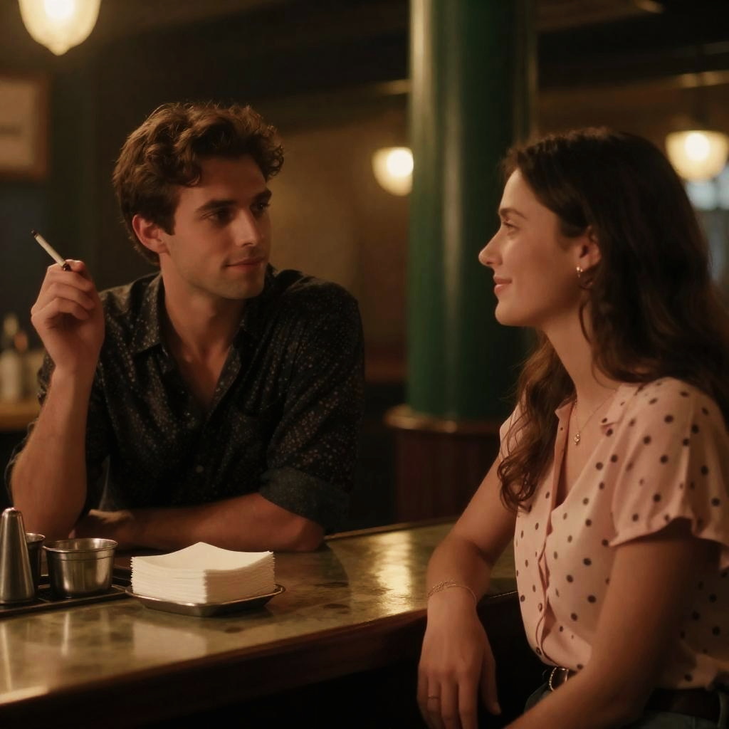 Photograph of a man and woman in a dimly lit bar. The man with short brown hair, wearing a black patterned shirt, stands behind the counter, holding a cigarette holder. The woman with long brown hair, in a pink polka dot blouse, sits across from him, smiling. Stacks of white napkins and small metal containers on the counter. Warm, yellow-hued background with blurred lights. The man looks at the woman, who looks back at him. Both have relaxed expressions. One green pillar in the background.