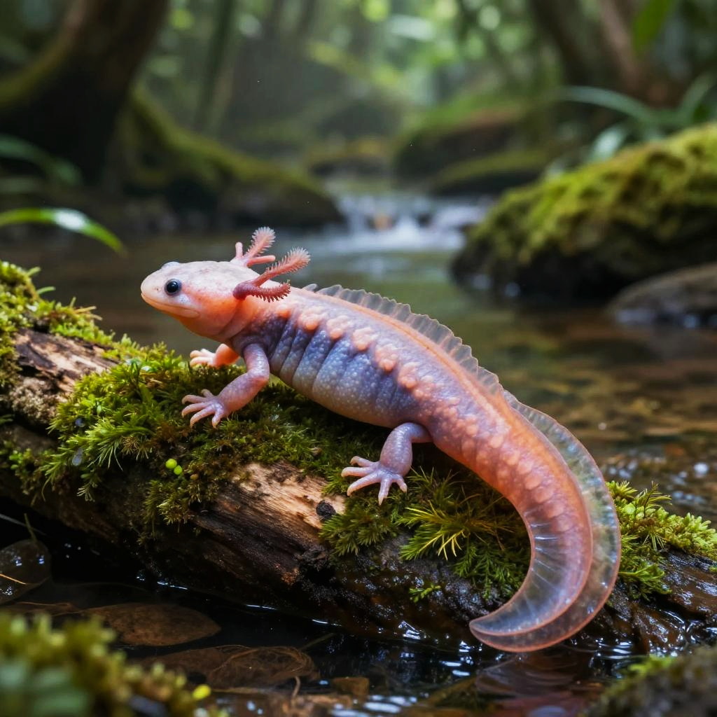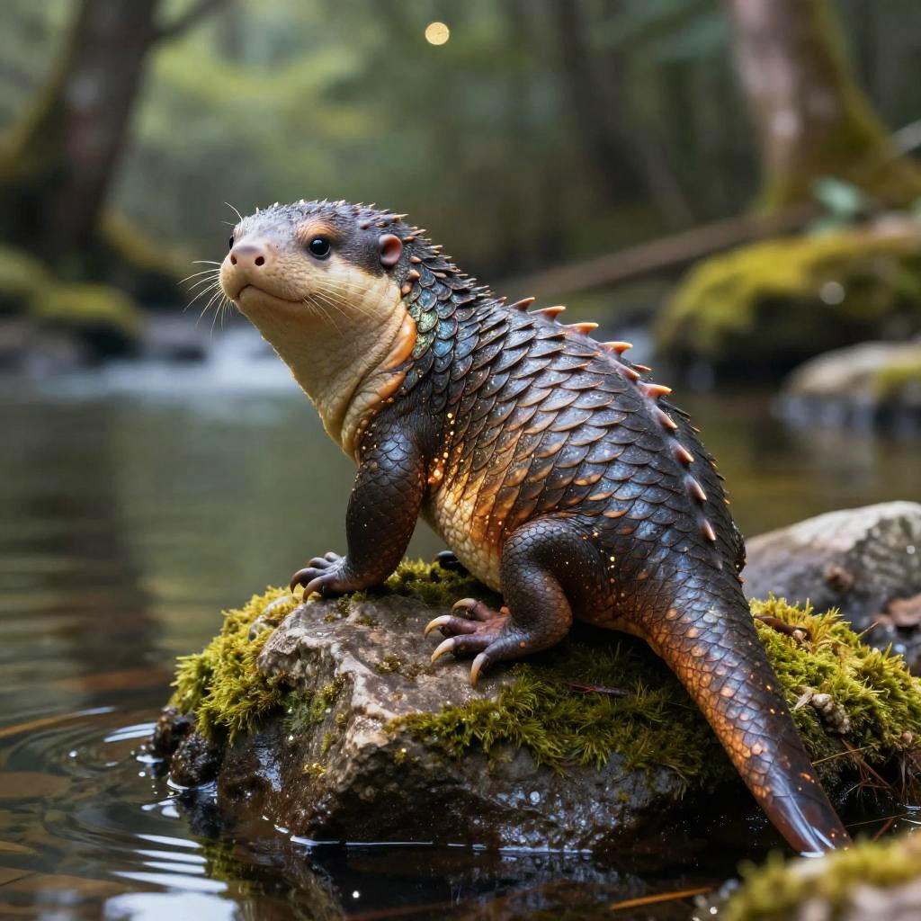 Platypus dragon hybrid perched on a mossy rock by a shimmering lake, vibrant scales blending reptilian and mammalian features, fantasy forest background, magical lighting