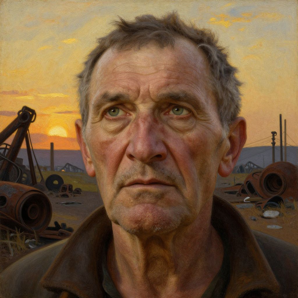 Digital portrait of a weathered, middle-aged man with short gray hair, intense gaze, and rugged features, set against a sunset sky with industrial junk