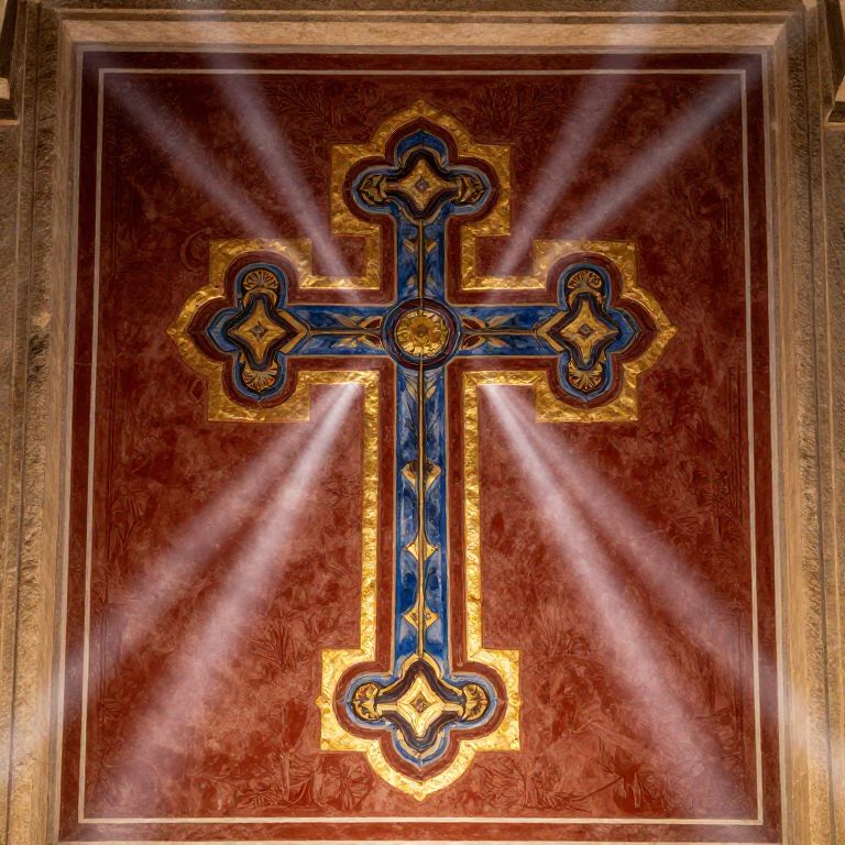 Orthodox cross art featuring detailed Byzantine style patterns, with gold leaf accents and deep reds and blues, framed by ancient stone textures and surrounded by ethereal glowing light beams, evoking a sense of sacred reverence and historic religious tradition.