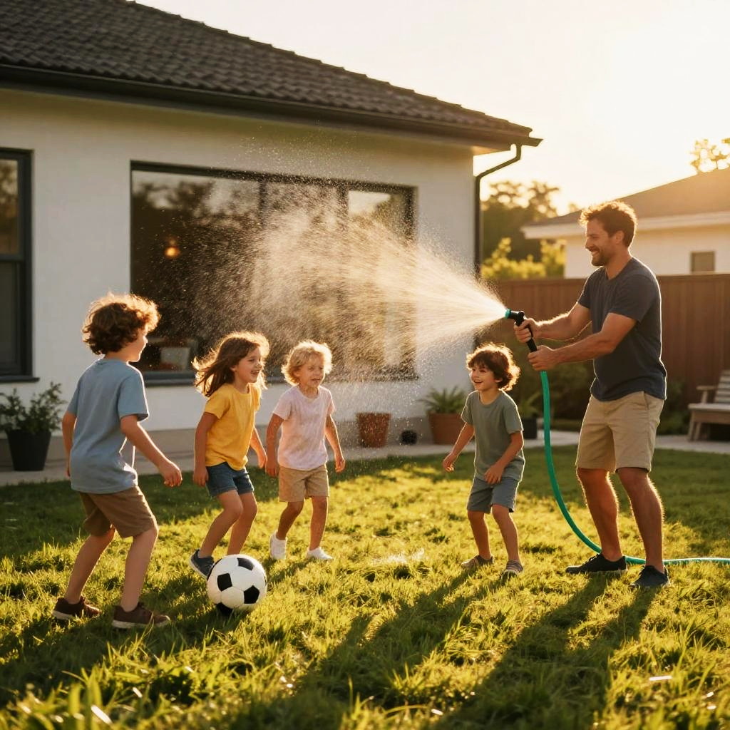 A joyful family scene in the backyard during golden hour lighting, with natural sunlight casting warm tones and soft shadows. A man sprays water with a hose while three children play nearby on green grass, one with a soccer ball. The background features a modern house with large windows reflecting the warm sunset, capturing a candid, lively moment full of happiness and vibrant outdoor colors.